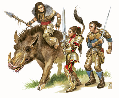 From left to right: ghostwise halfling (on boar), strongheart halfling, lightfoot halfling