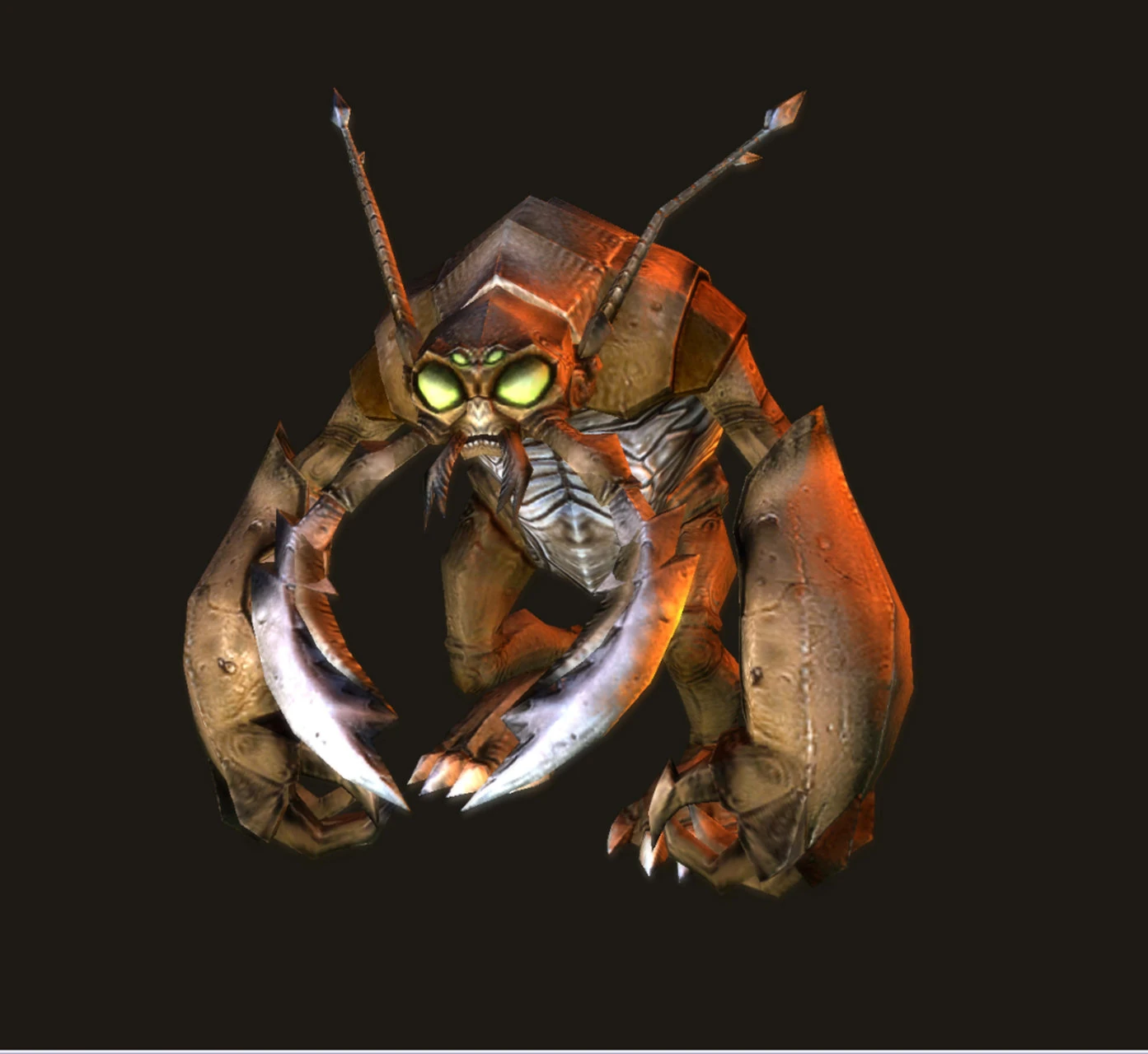 "This hulking, powerfully built creature looks something like a cross between a great ape and a beetle. The low, rounded head is dominated by a massive pair of mandibles and rows of triangular teeth. It has two big compound eyes like a beetle's, with two smaller eyes like an ape's in between. Armor plates cover virtually all of its chitinous body, whose scattered feelers resemble sparse hair."